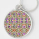 Round keychain featuring intricate floral patterns in pink, purple, and brown. The keychain rests on a table near greenery, a notepad, and a smartphone.