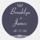 Round nautical wedding stickers with white anchor and white text printed on navy blue background with anchor pattern