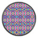 Round object with a vibrant geometric pattern in pink, blue, yellow, and purple. The design features symmetrical shapes, creating a lively, kaleidoscopic effect.