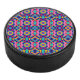 Round object with a vibrant geometric pattern hockey puck
