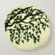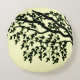 Silhouette of tree with weeping branches/leaves. Black image has a hint of green at the edges. Background is pale yellow.