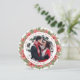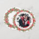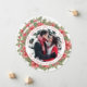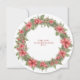 This round wreath Christmas card features a wreath with green foliage and red berries accented by red poinsettias. The greeting is arranged in curved text that says "Merry Christmas and a happy new year." You can add your name and date to the lower half. The back has a coordinating poinsettia pattern. The back has a coordinating wreath with a place for you to add a personal message.