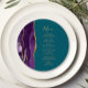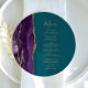 The left-hand edge of this elegant round modern wedding menu features a purple watercolor agate border trimmed with faux gold glitter. The customisable text combines gold-coloured handwriting script and copperplate fonts on a teal blue background. The reverse side features a matching purple and gold agate design.