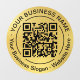 Modern, elegant round black QR code and circle text with frame on a gold foil background window decal. Insert your QR code with a transparent background as an ~.svg, ~.ai or ~.png file. You can replace the gold foil background with an image of your choice. Transform your storefront or car windows into powerful marketing tools! y.BEE PAPERIE #ZazzleMade #businessdoordecals #RoundQRCodedecals #QRCodedoorsticker