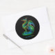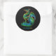 round sticker with a colourful scratching dragon