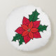 Round throw pillow with red orange Christmas poinsettia, with dark green leaves and a black outline. This design is added on both sides of the pillow