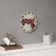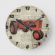 Round wall clock with image of a vintage tractor against vintage newsprint.