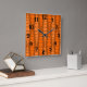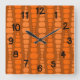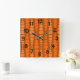This wall clock has a mid-century modern design of rounded rectangles in two shades of orange running vertically on a field of brown.