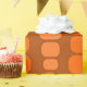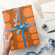 This wrapping paper has a mid-century modern design of rounded rectangles in two shades of orange running vertically on a field of brown.
