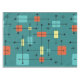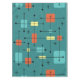 This atomic-age inspired mid century modern design has bold lines and geometric shapes in teal, turquoise, yellow and orange.