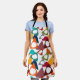 This apron has a mid-century modern design of scattered triangles, some with holes, in retro colours.
