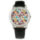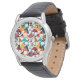 This watch has a mid-century modern design of scattered triangles, some with holes, in retro colours.