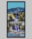 A digital landscape painting of scenic Vermont. Stowe Mountain rises above Moss Glen Falls, with a light blue sky as a background. As the cold water rushes down to go beneath a covered bridge, it ends up in Warren Falls. There is a black border around the artwork. In a white font there is, "Vermont", "Beautiful Route 100". And you can find the statehood year at the bridge footings, looking like a carved 1791. A turkey stands watchful at the bridge's entrance. Image Copyright ©2023 Kimberly J Tilley.