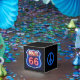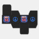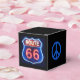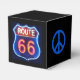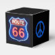 This black square classic-style favour box with its image of a Route 66 red, white and blue neon sign, is appropriate for a 20s, 40s, and 60s decade party! The sides have an image of a royal blue peace symbol. U.S. Route 66 (also known as the Will Rogers Highway after the humorist, and colloquially known as the "Main Street of America" or the "Mother Road") was a highway within the U.S. Highway System. One of the original U.S. highways, Route 66 was established in November 1926- with road signs erected the following year. It was recognised in popular culture by both a hit song originally recorded by the Nat King Cole Trio in 1946, and the Route 66 television show in the 1960s.