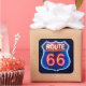 This square sticker with its image of a Route 66 red, white and blue neon sign on black, is an appropriate special touch or favour for a 20s, 40s, and 60s decade party!
