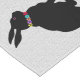 This table runner has a row of sitting black silhouette bunny rabbits with tall ears wearing a ring of colourful flowers around their necks on a light grey background.