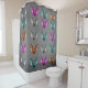 This shower curtain for your bathroom has a grey background with rows of Gothic flying bats in various colours of grey, pink, blue, green, and orange.