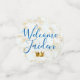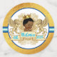 Adorable African Prince wearing a gold crown on an elegant golden lion's crest; resting on a blue ,white and gold polo stripe. Include your favourite photo! Great for Royal Prince Birthday or Prince Baby Shower. ©2022 Miss Sassy Party Designs