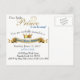 Royal Little Prince baby shower postcard invitation with adorable ethnic prince wearing gold crown on an elegant golden crest resting on a royal blue background.