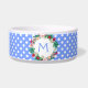 White ceramic dog food / water bowl done in royal blue with white polka dots. A pretty round floral wreath has a blue one letter monogram ready to personalise, for your pet or as a great gift idea for any pet owner.