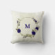 Beautiful romantic throw pillow featuring royal blue and beige flowers and some leaves .