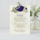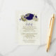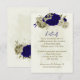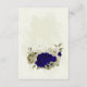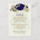 Beautiful romantic wedding reception details enclosure card featuring royal blue and beige flowers and some leaves .