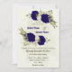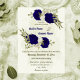 Beautiful romantic wedding invitations featuring royal blue and beige flowers and some leaves .