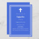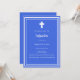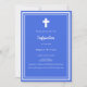 A royal blue background, decorated with a white frame, and a white cross Personalise and add the name and details. White text.