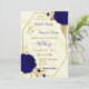 elegant luxury royal blue flowers with some gold leaves on faux foil gold geometric frame against marble background wedding invitation