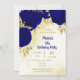 Beautiful birthday party invitation featuring Royal blue flowers and gold leaves.