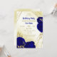 Beautiful birthday party invitation featuring Royal blue flowers and gold leaves.