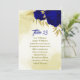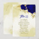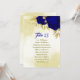 Beautiful wedding seating chart card featuring Royal blue flowers and gold leaves.