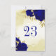 Beautiful wedding table number card featuring Royal blue flowers and gold leaves.