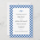 Easy to customise formal and elegant text looks chic framed by a border pattern of deep lapis blue gingham check with a simple three letter traditional monogram at the top of this classic style baby shower invitation.