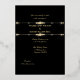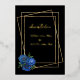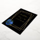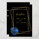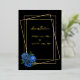 A stunning wedding invitation, elegant in black and gold foil, with a glam royal blue rose accent