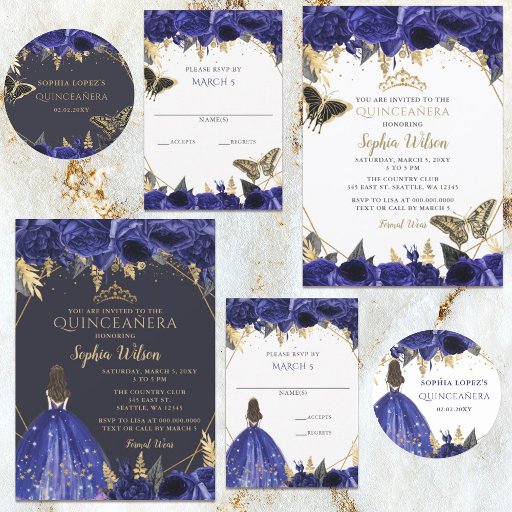 Royal Blue Gold Floral Quinceanera Sweet 16 SetDesigned by Maria G