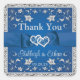 This romantic wedding favour thank you sticker has a royal blue ribbon, bow, and joined hearts image across the centre front. There is a main royal blue background colour that has silver floral arches above and below the ribbon and it is all surrounded by a simulated silver border. Above the ribbon in light grey, the words, "Thank You" are printed in grey. Below the ribbon, the names of the couple and the wedding date are printed in grey. This small square wedding favour sticker could also be used on your thank you card envelopes and on your wedding favours You can also choose a larger 3" size if needed. If you need any other matching items, please email niteowlstudio@gmail.com and watch your spam/junk folders for my reply, or use the Zazzle chat feature to contact me.