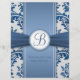 Royal blue leafy damask pattern Monogrammed Wedding Dinner Menu Flyer. Please note, Ribbon is the printed image. You can move ribbon and round frame up and down or simply remove them.
