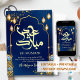 An exquisite Eid Mubarak card featuring a royal blue background adorned with shimmering gold peacock feathers, glowing lanterns, and magical bokeh lights.