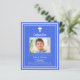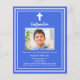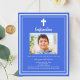 Royal blue background, decorated with a white frame, and a white cross Personalise and add a photo name and details. White text.