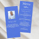 Birthday party menu card. Personalise and add a name, age, date and the menu. A royal blue background. White coloured letters.