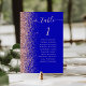 The left-hand edge of this elegant modern wedding table number card features a rose gold faux glitter border. The word "table" appears in rose pink whimsical handwriting script on a royal blue background. Add the names of your guests who are assigned to each table.