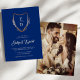 This design features traditional classic romantic royal blue and rustic golden coloured background, elegant monogram and calligraphy script personalised photo save the date invitation. This product can be easily personalised. If you need help with the customisation of the product or need matching products kindly please contact me via Zazzle.
