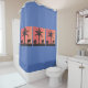 This royal blue shower curtain is designed with my depiction of two elephants and a palm tree silhouetted against an orange sunset sky.