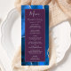 This elegant, modern wedding menu features a watercolor royal blue agate background trimmed with silver faux glitter. The text appears in elegant silver grey handwriting and copperplate fonts on a plum rectangle. The agate design is repeated on the reverse.