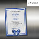 A modern, elegant magnetic wedding invitation. Faux silver looking background decorated with royal blue frames and bow. Personalise and add your names and wedding details. Black coloured letters.