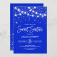 This majestic and glamourous sweet sixteen birthday party invitation is perfect for the girly girl. It features glowing hanging light strands on top of faux printed silver sparkly glitter confetti on a royal blue background inspired by stars in the night sky. It's pretty, chic, modern, trendy, and cool; the perfect design for your daughter's special day.