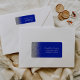 The left-hand edge of this elegant modern wedding return address label features a silver faux glitter design. The customisable text combines white handwriting, copperplate and italic fonts on a royal blue background.