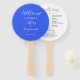Wedding day program printed on a round style hand fan that features a trendy, royal blue colour background on the front side with the bride and groom names in white, stylised script. Back side of program lists the wedding party participants and ceremony rites on a white background with dark grey lettering. Edit hand fan and replace wedding program info with your own. Perfect for an indoor or outdoor wedding ceremony! Select number of hand fan programs desired.