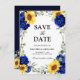 Elegant and modern rustic country wedding save the date card features bright yellow sunflower, Royal blue peonies , baby’s breath, gypsophila floral frame / wreath with eucalyptus leaves and gold glitter frame. Please find more matching designs and variations from my "blissweddingpaperie" store. And feel free to contact me for further customisation or matching items.